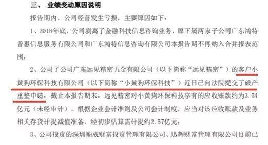 公告中称,基于以下原因作出上述预测:2018年底剥离了金融科技信息咨询业务,原下属两家子公司广东鸿特普惠信息服务有限公司和广东鸿特信息咨询有限公司本报告期不再纳入合并报表范围;子公司广东远见精密五金有限公司的客户小黄狗环保科技有限公司(下称“小黄狗环保”)近日已向法院提交了破产重整申请,截止本报告期末,远见精密对小黄狗环保科技享有的应收账款约为3.54亿元(未经审计);投资的深圳顺成财富投资管理有限公司、迅辉财富管理有限公司目前已处于人员解散、业务中止的非正常经营状态,根据企业会计准则及公司会计制度,对以上两家公司的投资额(合计2,000万元)全额计提减值损失。