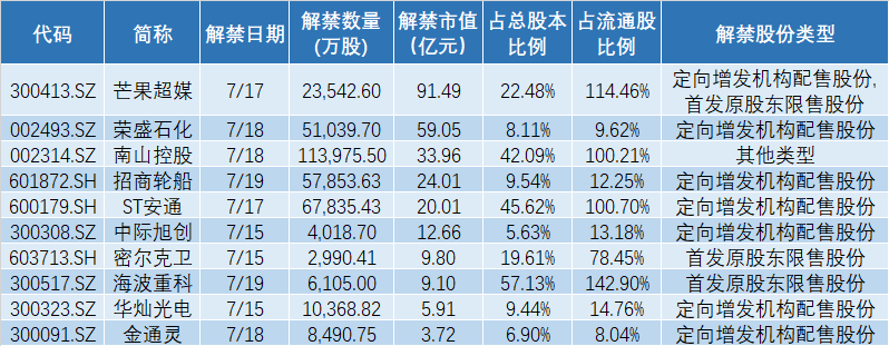 根据统计,限售股解禁数量超过1亿股的上市公司合计有6家,分别为南山控股(002314.SZ)、ST安通(600179.SH)、招商轮船(601872.SH)、荣盛石化(002493.SZ)、芒果超媒(300413.SZ)、华灿光电(300323.SZ)。