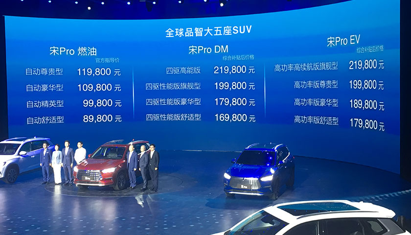 7月11日,比亚迪宋Pro在北京正式上市。包括燃油版、混动版以及电动版在内,共计三种不同驱动模式的12款车型,上市价格区间分别为:燃油版8.98—11.98万元、混动版(综合补贴后)16.98—21.98万元、纯电动版(综合补贴后)17.98—21.98万元。