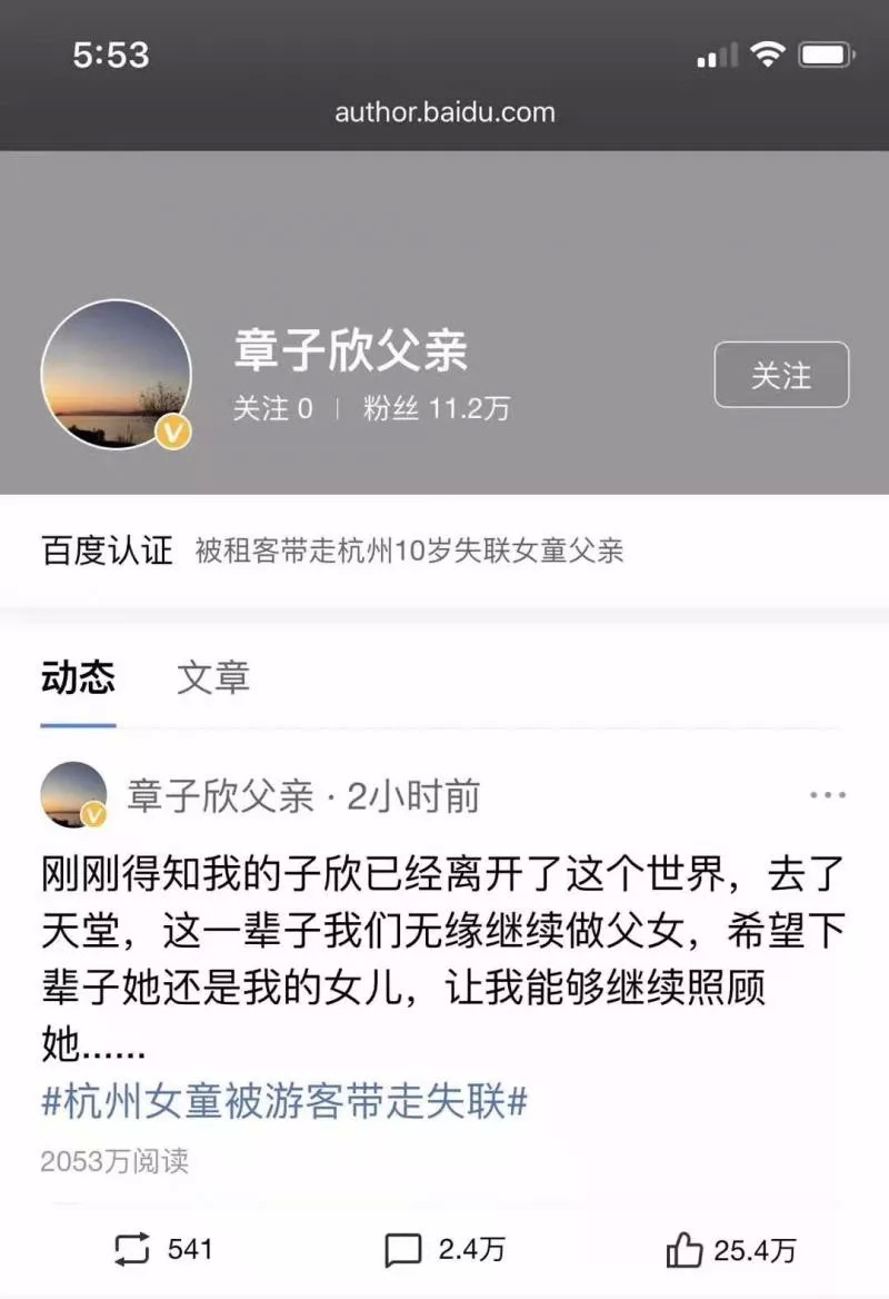 孩子被找到消息一出来,上述名为“章子欣父亲”的账号发文:“刚刚得知我的子欣已经离开了这个世界,去了天堂,这一辈子我们无缘继续做父女,希望下辈子她还是我的女儿,让我能够继续照顾她......” 。