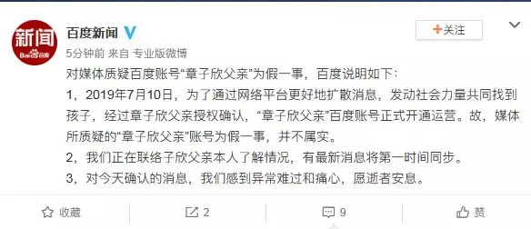 按照百度说法,7月10日,为了通过网络平台更好地扩散消息,发动社会力量共同找到孩子,经过章子欣父亲授权确认,“章子欣父亲”百度账号正式开通运营。