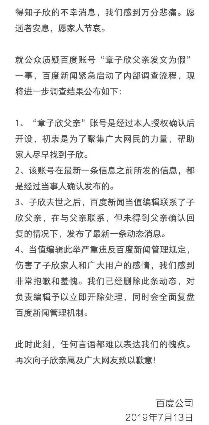 晚上10点多,百度再次发声明,称就公众质疑百度账号“章子欣父亲发文为假”一事,百度新闻紧急启动了内部调查流程。并公布了调查结果。