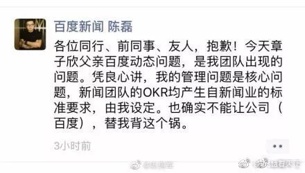 7月14日凌晨,百度新闻负责人陈磊在微信朋友圈表示:各位同行、前同事、友人,抱歉!章子欣父亲百度动态问题,是我团队出现的问题。凭良心讲,我的管理问题是核心问题,新闻团队的OKR均产生自新闻业的标准要求,由我设定。也确实不能让公司(百度),替我背这个锅。