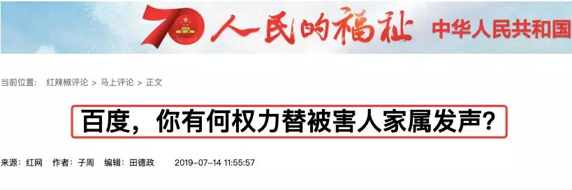 湖南省委、省政府重点新闻网站红网7月14日发表了题为《百度,你有何权力替被害人家属发声?》的评论。
