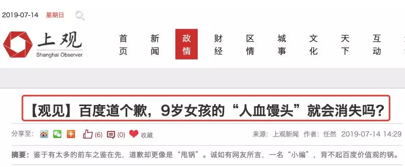 相比之下,《解放日报》旗下的上观对百度的批评更一针见血。7月14日下午,标题为《百度道个歉,9岁女孩的“人血馒头”就会消失吗?》的文章出炉。