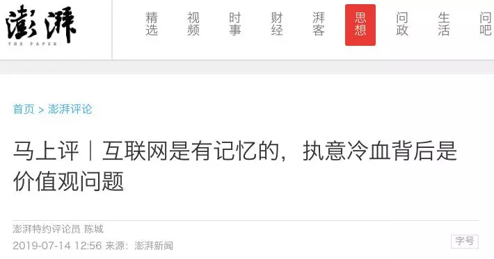 上海报业集团主管的澎湃新闻也于7月14发表了题为《互联网是有记忆的,执意冷血背后是价值观问题》的评论员文章。