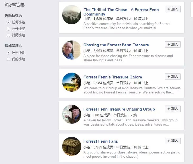如果在 Facebook 上搜索关键词“ Forrest Fenn”,你会发现有这样一组小组 ——