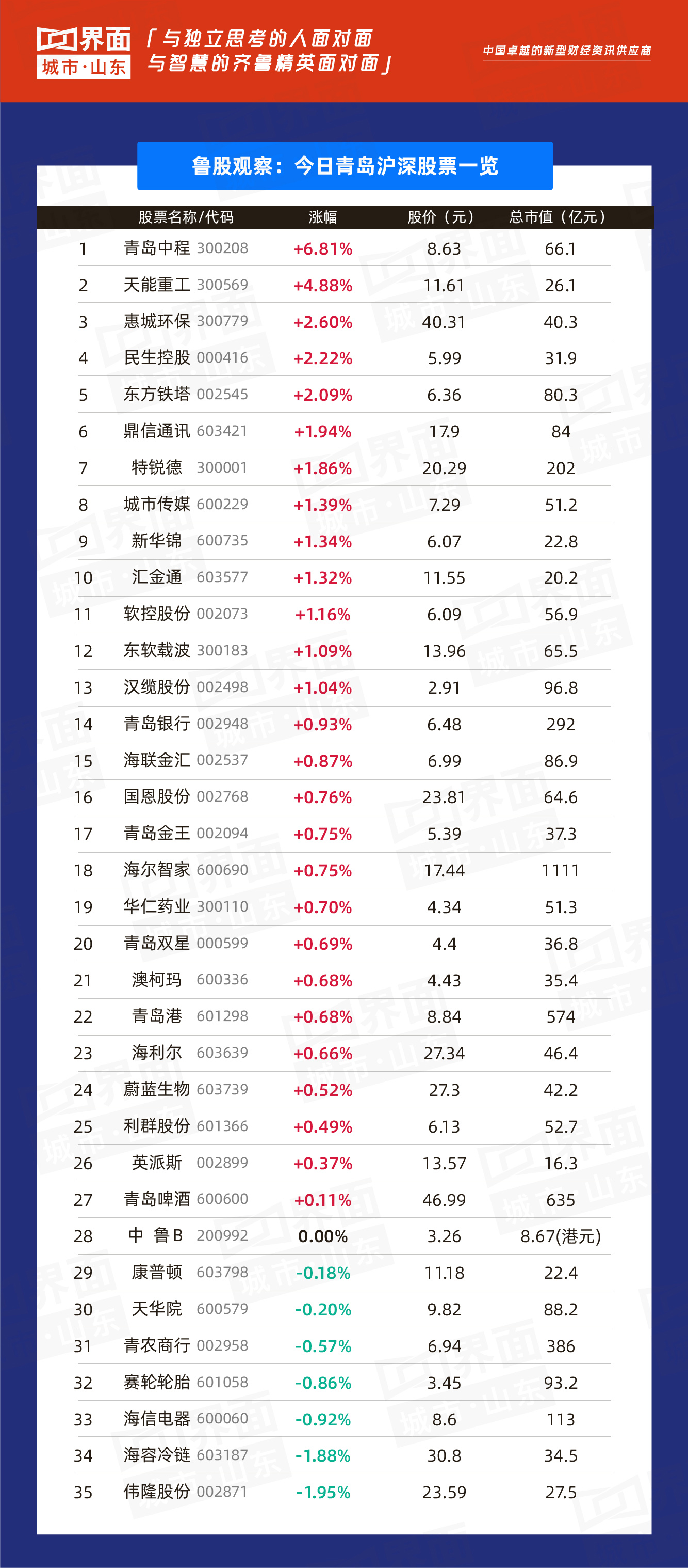 青岛市涨幅榜首:青岛中程(300208),涨幅6.81%,股价8.63元,总市值66.1亿元;