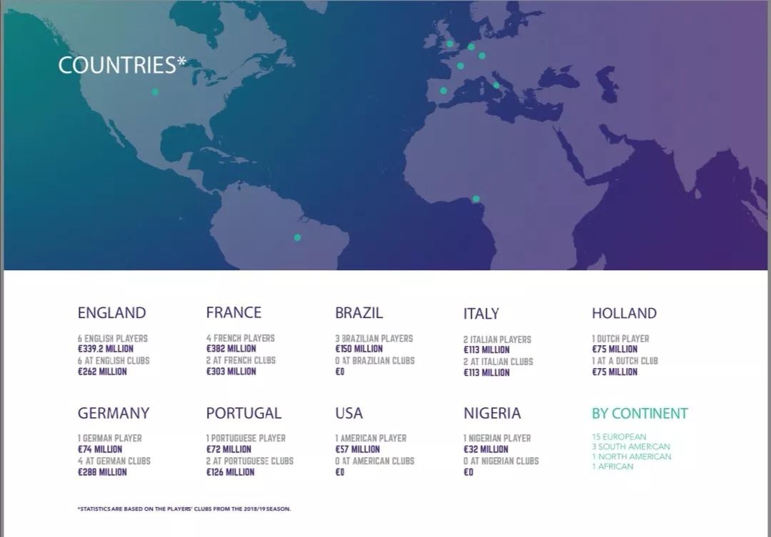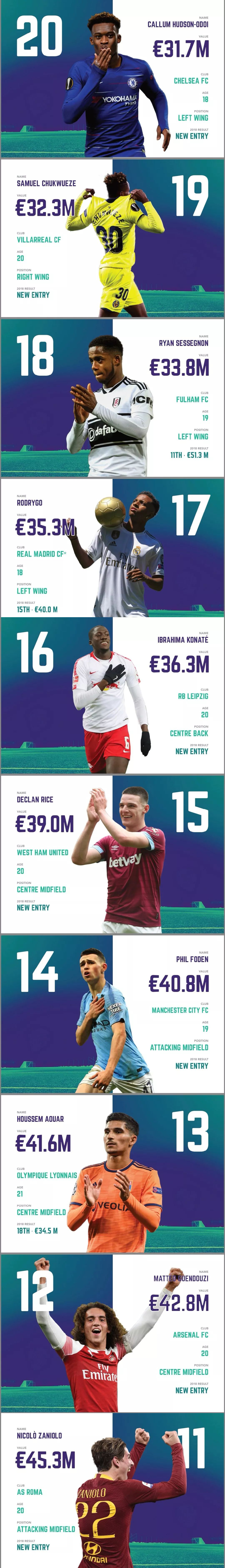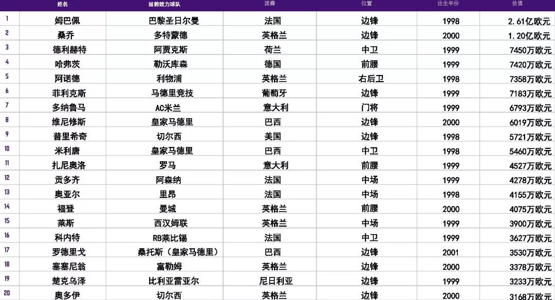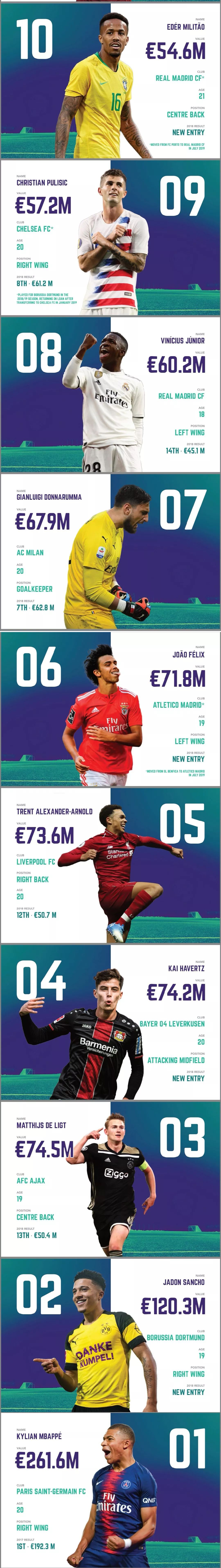值得注意的是,这份榜单中并未有传统中锋入选,小基恩,库特罗内都被排在20名之外,姆巴佩这种类型的球员会成为未来足坛9号的趋势。