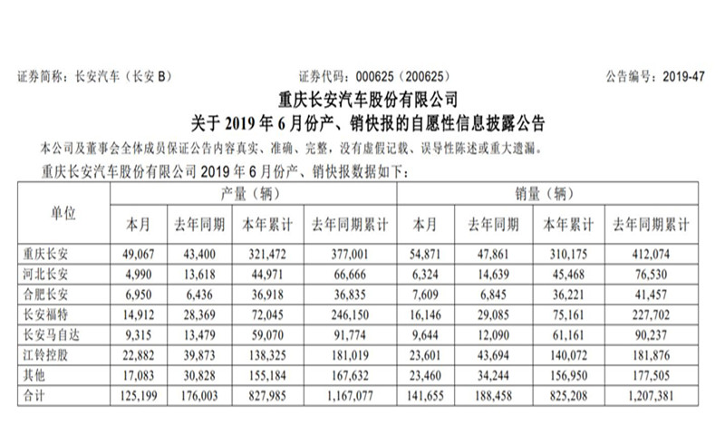 7月15日,长安汽车发布《2019 年半年度业绩预告 》,据公告称2019年上半年公司预计亏损19亿元-26亿元,归属于上市公司股东的净利润较去年同期下滑218.04%-261.53%。在业绩报告中长安汽车还表示,公司出现巨额亏损主要受今年1-6月销量下滑影响。