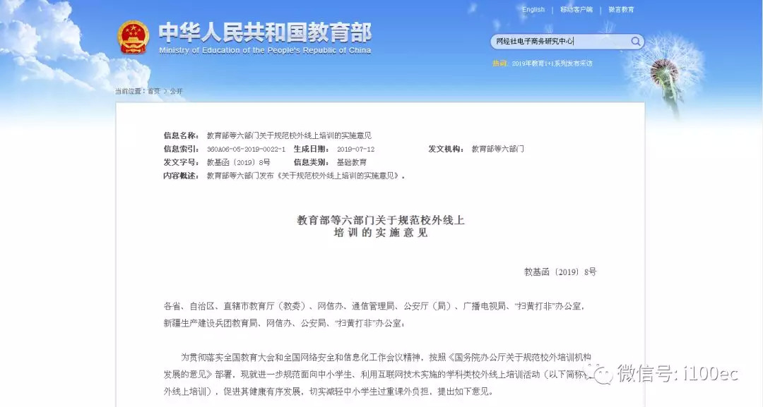 7月15日,教育部、中央网信办、工业和信息化部、公安部等六部门联合发布了《关于规范校外线上培训的实施意见》(以下简称《意见》)。该《意见》对面向中小学生、利用互联网技术实施的学科类校外线上培训活动提出了规范意见。这也是国家层面颁布的第一个专门针对校外线上培训活动的规范性文件。对此,电商智库网经社电子商务研究中心特发布电商快评给予分析点评。