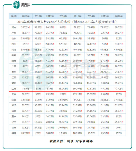 学源方面,近些年随着我国高考扩招政策的落实与完善,及重视高等教育的人越来越多,参加高考的人数也逐年递增,为高等上市教育企业学源带来增量的机遇。据教育部公开资料显示,2019年全国高考报名人数1031万(不含高职扩招补报名人数),这是自2009年之后的十年来,我国高考报名人口首次突破千万。其中、云南省(与本次新华教育收购有关)高考报名人数增速较快,从2012年的21万增至2019年的32.6万,年复合增速为6.48%,高于同期全国高考报名人数年复合增速的5.93%。(如下图所示)