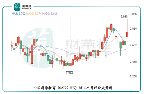 受收购消息影响,今日早盘新华教育股价一度上涨12.03%至2.980港元/股,创出近3个月新高。随后股价冲高回落,截至今日收盘,新华教育股价报收2.82港元/股,涨幅为6.02%。