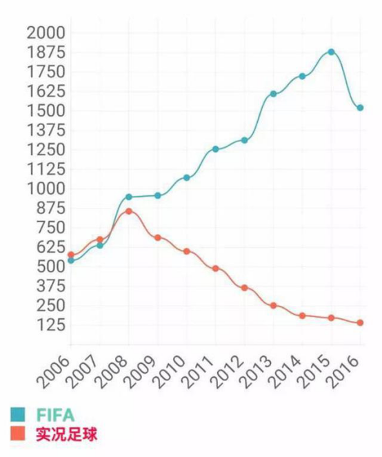 VGtime也统计过一份数据,在2010年的时候,《FIFA 10》销量是1073万,是《实况足球2010》销量599万的1.8倍,但到了2016年两者差距已经是10倍以上。
