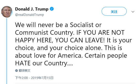就在四位女议员召开新闻发布会之际,特朗普正在推特上“奋笔疾书”。在过去一天他总共发了15条推特,其中最令人印象深刻的一条是大写字母标明的:“如果你在这儿不高兴你可以走!”可以想见特朗普当时真的充满了愤怒。