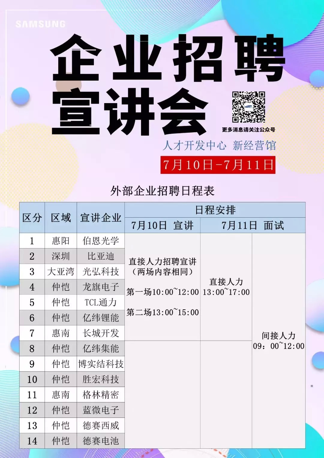 惠州三星电子在7月10日和11日举办了两场招聘宣讲会,它们邀请了伯恩光学、比亚迪、光弘科技、TCL通力、德赛电池等14家企业陆续进场招聘,为三星工厂员工寻找下家。这则招聘通告在某种程度上也证实了惠州三星的调整。按照正常运营公司的做法,鲜有公司发布招聘宣讲会是为外部企业招聘人员。