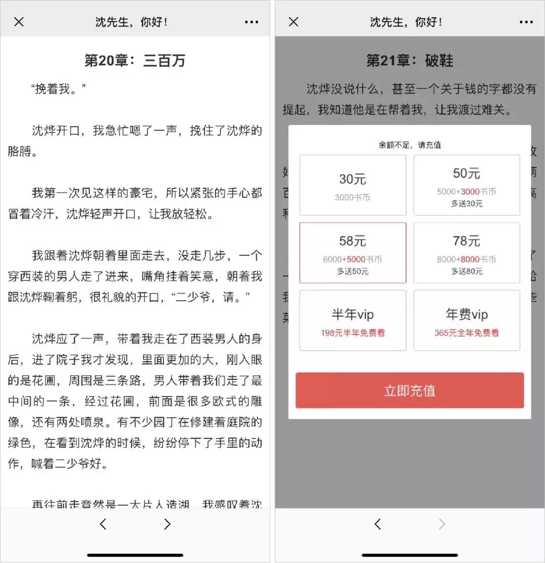 当看到最精彩的地方时,就会出现提示,要求你关注XX公众号才能往下看,关注了之后,看上两三章,突然又有一个链接跳转出来,要求你充值金币才能“继续看”,一般起充是三十元。