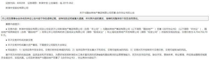 7月16日晚间,新湖中宝股份有限公司(SH:600208,简称“新湖中宝”)发布公告,新湖中宝及其全资子公司新湖地产集团有限公司(简称“新湖地产”)与融创房地产集团有限公司(以下简称“融创地产”)签署《合作协议书》,融创地产方面将受让新湖中宝持有的浙江瓯瓴实业有限公司(简称“瓯瓴实业”)和上海玛宝房地产开发有限公司(简称“玛宝公司”)的股权及相应权益,交易价款约67.05亿元。