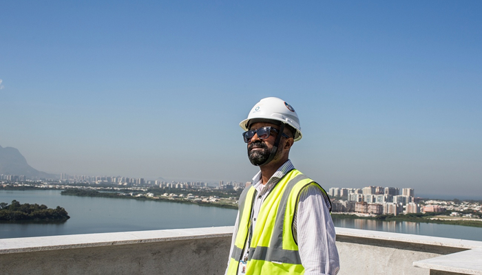 很少建筑工人能像Geovane一样,在他们的工作场地看到如此壮观美丽的风景。作为里约奥运村最高建筑运动员公寓的现场监理,每天站在半完工的屋顶上,他可以清楚地看到漫长的大西洋金色海滩一直蔓延至遥远的森林山脉。北边还有沿湖而立的水上运动中心、主体育场和网球馆,南边的高尔夫球场一片绿油油,景观甚美。