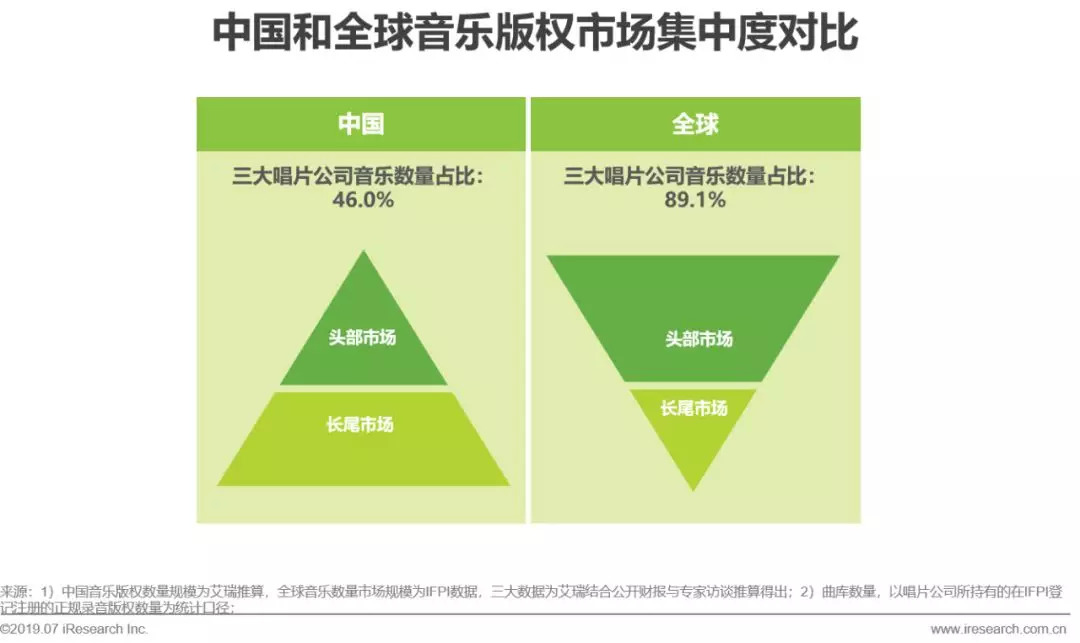 其次,虽然曾受盗版的影响而发展滞缓,中国整体音乐产业由于发展历史长久,已形成相对成熟、独立的产业链,市场不乏优质的音乐内容,且与全球音乐版权市场的高集中度相比,中国音乐版权市场表现出长尾内容占据主导的现状与趋势,呈现出集中度低和多元化的特点,这在环球、索尼和华纳这全球三大唱片公司在中国市场的曲库数量占有率上能得到体现。