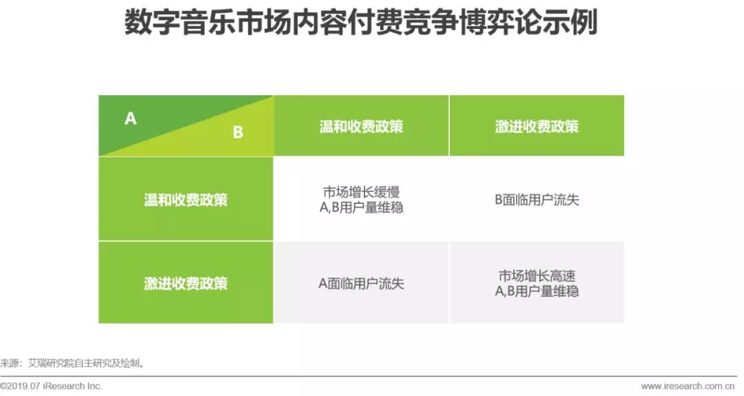以博弈论为模型,假设市场中存在双寡头的情况下,市场最有效的情况是平台A和平台B均采取激进收费政策,才能在短时间内将付费提升到国际平均水平,但在静态博弈的环境中,A与B作为非合作方,若其中一方贸然采取激进收费政策而另一方没有,则会导致首先采取激进收费政策的一方的用户流失。因此理论上来看,双方最终会停留在模型中的“纳什平衡点”,即市场中的主要竞争者都尝试采取温和的收费政策,以免引起用户流失。