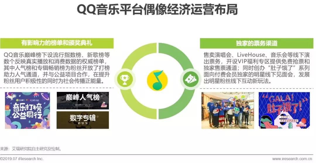 从策略上看,数字音乐平台对于偶像经济的运营可以分为两类:其一,发展有影响力的榜单和颁奖典礼,吸引粉丝用户为偶像打榜应援;其二,发展独家的票务渠道,售卖偶像明星线下演唱会、见面会等活动的门票,甚至可以尝试自主举办相关活动,为会员用户提供更加丰富且独特的特权。此类策略同样在QQ音乐平台已经初见端倪,其平台上的QQ音乐巅峰榜单已经发展成为音乐行业相对权威的排行榜,在下设的“人气榜”部分目前已开放了粉丝打榜助力人气公益的功能。2018年,QQ音乐发展出“肚子饿了”系列明星线下见面会,拉近了粉丝用户与偶像之间的距离。