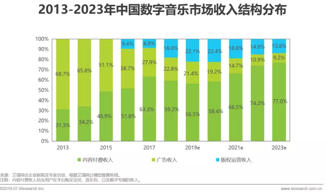 在数字音乐版权得到有效整治以前,中国数字音乐平台主要通过广告收入获得盈利,同时伴有少量的内容付费,以及如耳机、音响等周边硬件的售卖收入。随着版权的价值逐渐得到重视,用户付费意识增强,中国数字音乐的商业环境得到了体系化的建立和规整,因此在政策推行正版化后,用户内容付费收入的占比保持持续增高,目前总收入中内容付费的占比已超过广告收入,并且在未来将进一步占据更大的份额。参照视频、文学等同类型内容平台的发展现状,数字音乐平台也将能够形成以内容付费为主,版权运营、广告及其他收入为辅的成熟商业模式。