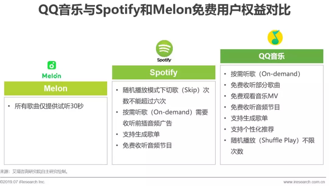 以中国的QQ音乐、美国的Spotify和韩国的Melon为例,QQ音乐平台免费用户不仅可以免费按需收听平台超过80%的歌曲、免费观看MV和音频节目等其他视听内容,更支持歌单生成、个性化推荐、随机播放等附加功能。而Spotify的免费用户权益相对更少,随机播放切歌不能超过六次,按需听歌需要收听前插音频广告,附加功能仅有生成歌单和少量音频节目。最后Melon作为韩国最具代表性的流媒体数字音乐平台,对免费用户仅提供歌曲试听30秒功能。