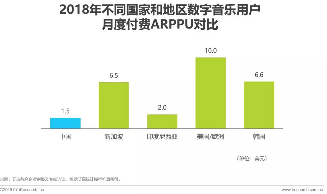 另一方面,从付费金额来看,数字音乐发展历时最久也是最成熟的欧美市场处于相对最高水平。而亚洲发达国家,例如新加坡和韩国付费金额则集中在每月6.5美元左右。印度尼西亚由于互联网经济仍在发展起步阶段,目前为每月2美元左右。