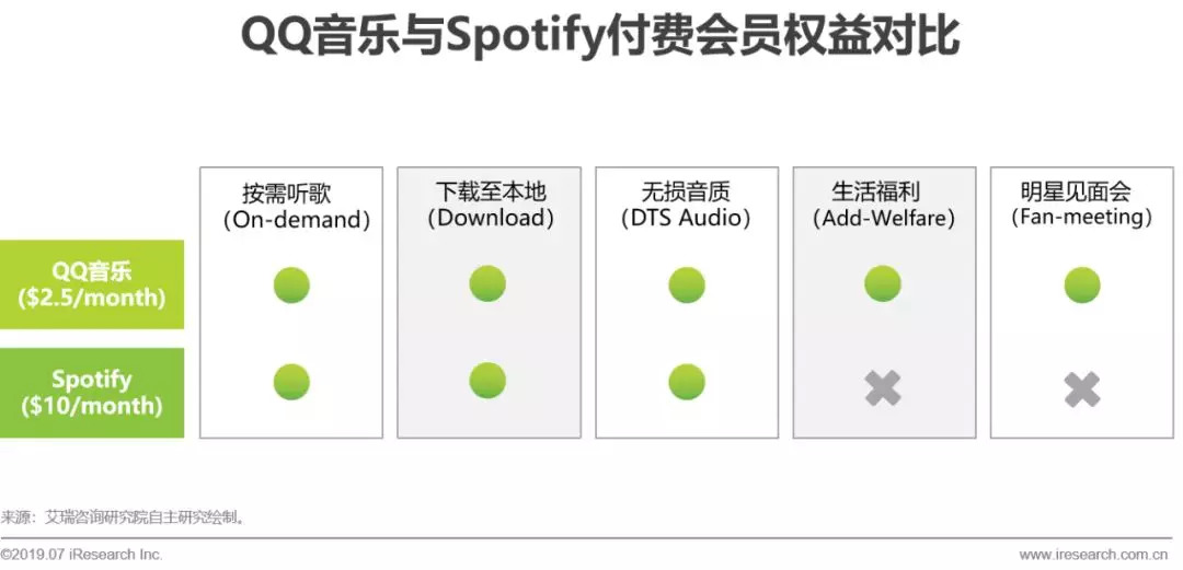 中国的主流数字音乐平台与海外相比为付费用户提供了更多的权益,价格也相对较低。具体来看,Spotify为付费会员提供的权益主要分为:按需听歌(包含生成自主歌单)、会员期间下载至本地播放、以及无损音质。而QQ音乐在此基础上更增添了生活福利和明星见面会两大权益。其中,生活福利包含电影票优惠券、健身卡、购物礼券等福利,更为会员提供线下演出和演唱会的优享票务渠道,并提供丰富的免费抽票机会。而明星见面会则是由QQ音乐定期举办的系列线下明星社交活动,意在拉近粉丝与明星之间的距离,有效增强平台的付费用户粘性。