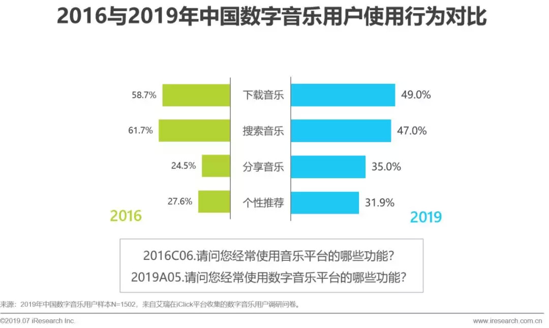 对比艾瑞在2016年所收集的在线音乐用户调研问卷,可以发现:经过三年,用户意愿的付费金额水平有明显的提升,从2016年的平均每月16.3元提升到了2019年的平均每月31.7元,涨幅接近两倍之多。而在另一方面,从用户对于数字音乐平台的使用行为来看,对音乐的分享和个性化推荐功能的使用均有提升。这代表了数字音乐平台正在面向社交化、智能化的趋势,同时随着流媒体播放(指以流式传输的方式在互联网平台上播放的音乐)的普及,用户下载音乐的行为将会进一步减少,这对刺激用户持续为音乐付费具有较好的帮助。