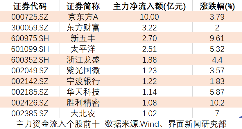 具体到细分行业,显示器件、畜禽养殖和纺织化学用品居主力热买前三,分别涌入14.83亿元、2.82亿元和2.63亿元;证券、通信传输设备和白酒被抛售最多,分别流出10.01亿元、7.59亿元和5.60亿元。