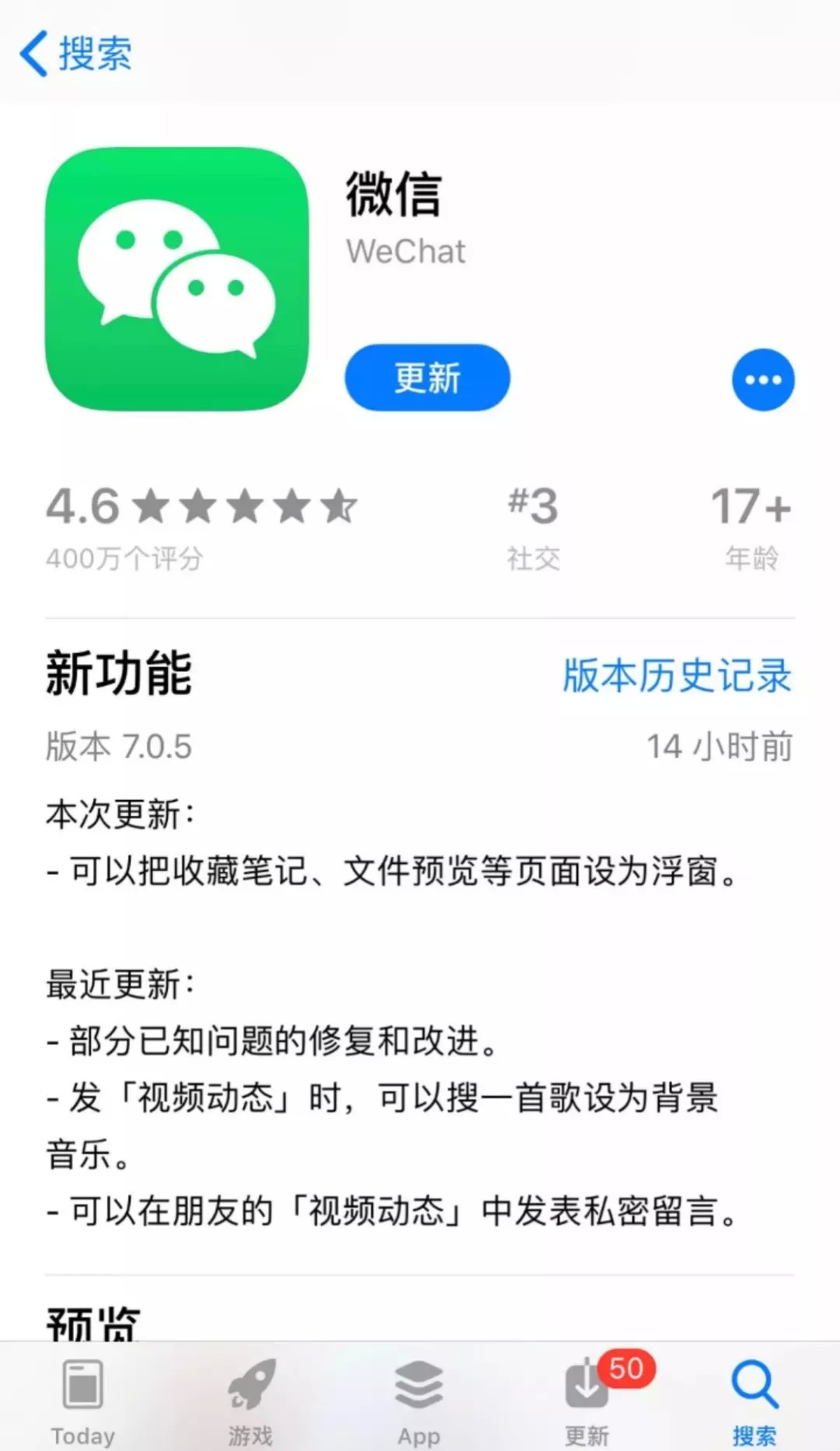 据《新商业情报NBT》体验,微信iOS版共进行了微信浮窗升级、视频动态支持音乐和私密留言、订阅号信息流页面和公众号历史消息界面改版、识别二维码样式变化、朋友圈视频WiFi下自动播放、朋友圈分组新增从群选择、转账界面优化等多项更新。