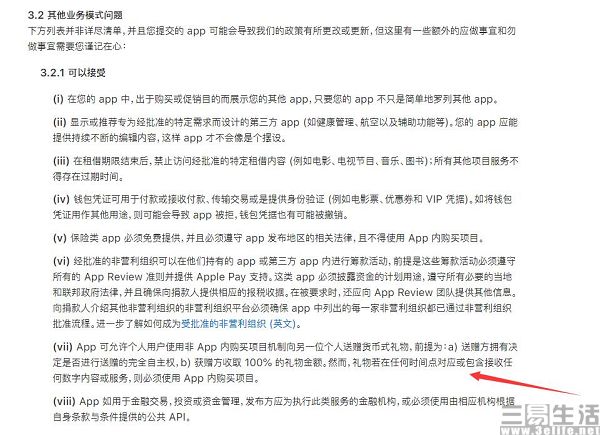 而针对IAP,早在2017年9月18日,苹果就更新了《App Store 审核指南》中3.2.1.7条款的相关内容。其核心内容是苹果允许用户使用非App内购买项目机制(IAP)向另一位个人赠送货币式礼物,但这种行为有两个前提条件——用户必须自己做决定,以及开发者不得从现金打赏中抽成,必须将全部打赏交给内容创作者。