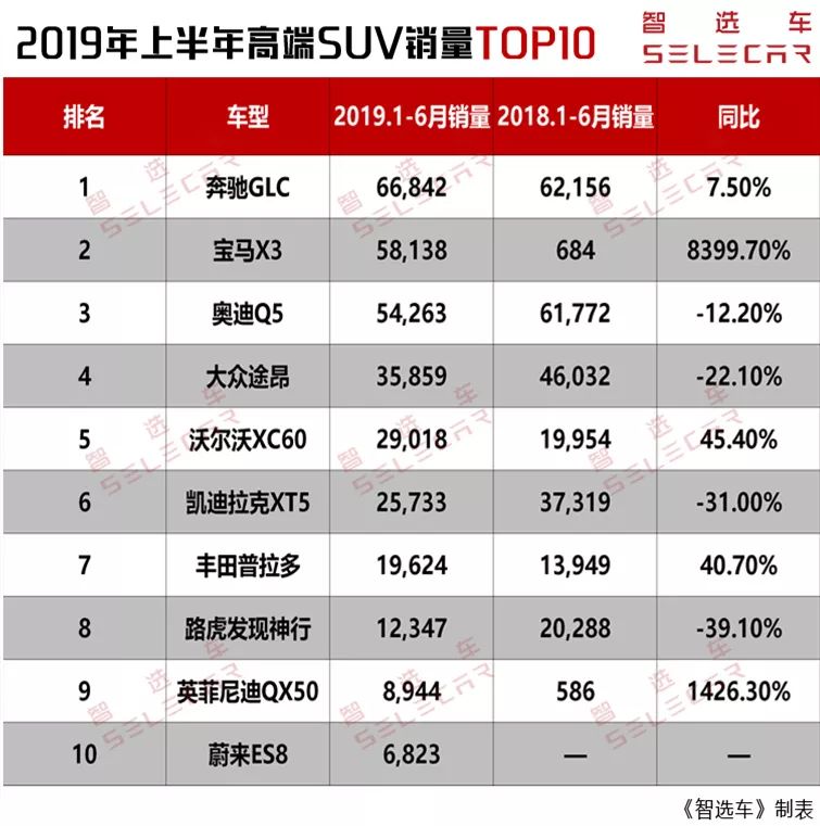 1·奔驰GLC在上半年以66842辆的市场表现荣登销冠,宝马X3则以接近9千辆的差距位居第2。此外,排行榜前3均被BBA占据,大众途昂名列第4。