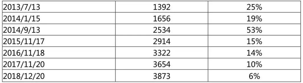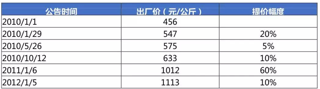 自2010年以来,东阿阿胶共发布过14次针对产品提价的公告,是一个名副其实的“提价王”。其中,东阿阿胶的产品阿胶块在2010年提价三次,上调幅度分别为20%、5%、10%;2011年一次性提价60%;2012年上调阿胶出厂价10%;2013年上调阿胶出厂价 25%;2014年三次上调,提价幅度分别为19%、53%;2015年两次提价,桃花姬阿胶糕出厂价25%,东阿阿胶、复方阿胶浆、桃花姬阿胶糕出厂价上调15%;2016年11月,东阿阿胶、复方阿胶浆和桃花姬阿胶糕出厂价分别上调14%、28%、25%;2017年11月,东阿阿胶、复方阿胶浆出厂价分别上调10%、5%;2018年12月,东阿阿胶出厂价上调 6%。