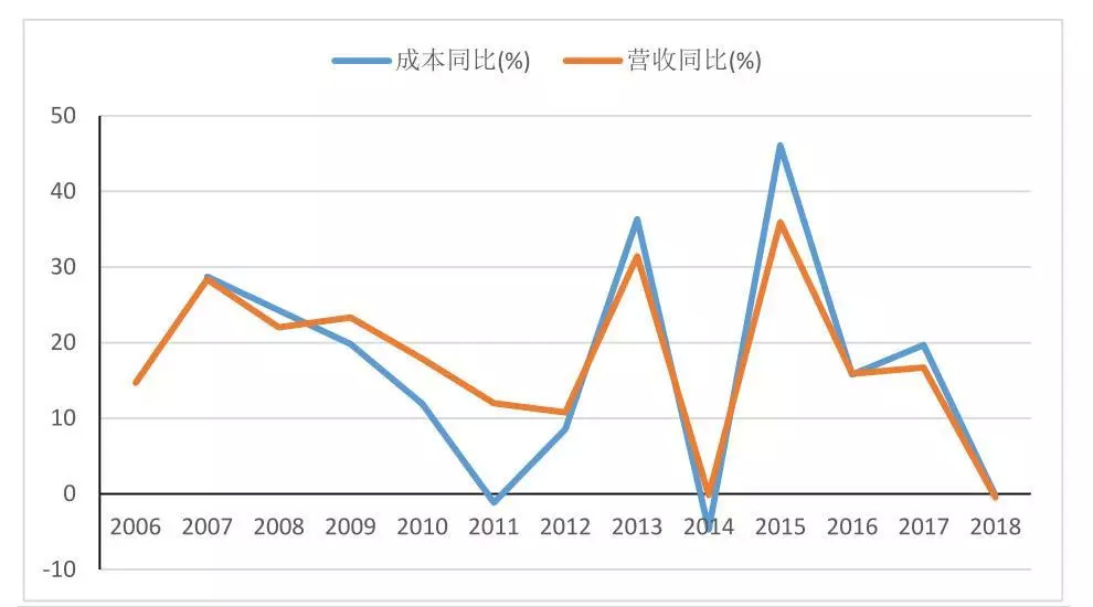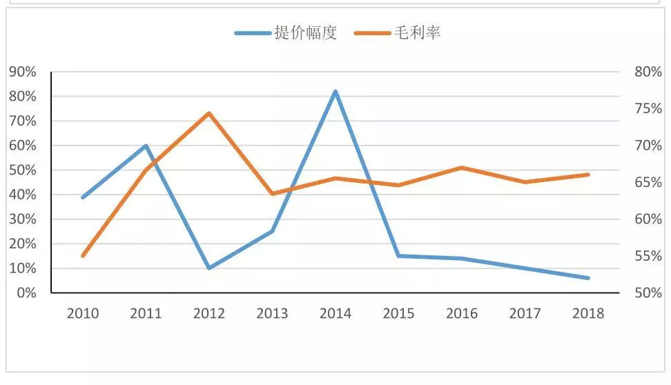 价格的不断上涨并没有带来公司营收和净利润的同比例上升,同期的公司营业收入从2009年的20.79元上升到2018年的73.38亿元,仅上涨3.53倍,同期净利润从2010年的3.92亿元上升到2018年的20.85亿元,上涨5.35倍。