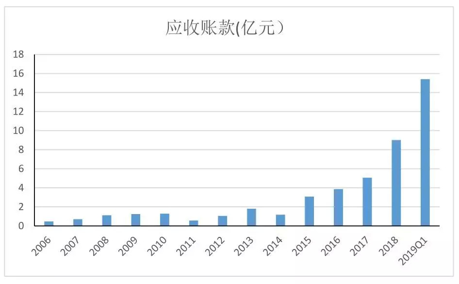 在提价遭遇天花板后,东阿阿胶为了销量,还放宽了销售信用政策,采用赊销方式,向经销商或渠道压货,但是也因此带来了应收账款的快速增加,无法阻挡营收净利双双下降。2019年一季度营收和扣非后归母净利润分别同比下降23.83%和38.36%,新增应收账款6.38亿元,占一季度营收的49.38%,在营业收入没有增长的情况下,应收账款却大幅增加,造成这种情况可能有两种原因:一是公司对下游的议价能力大幅降低;二是下游的经销商财务可能出现恶化。不管是哪种情况,对公司来说都是一个危险的信号。