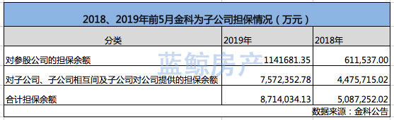 到了2019年,金科股份的这一动作还在持续。根据金科股份公告,截至5月末,金科股份对参股公司提供的担保余额为114.17亿元,同比增长86.7%;对子公司、子公司相互间及子公司对公司提供的担保余额为757.24亿元,同比增长68.5%;合计担保余额为871.4亿元,同比增长71%。