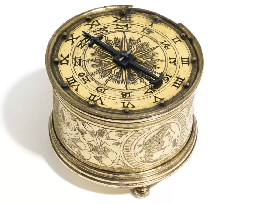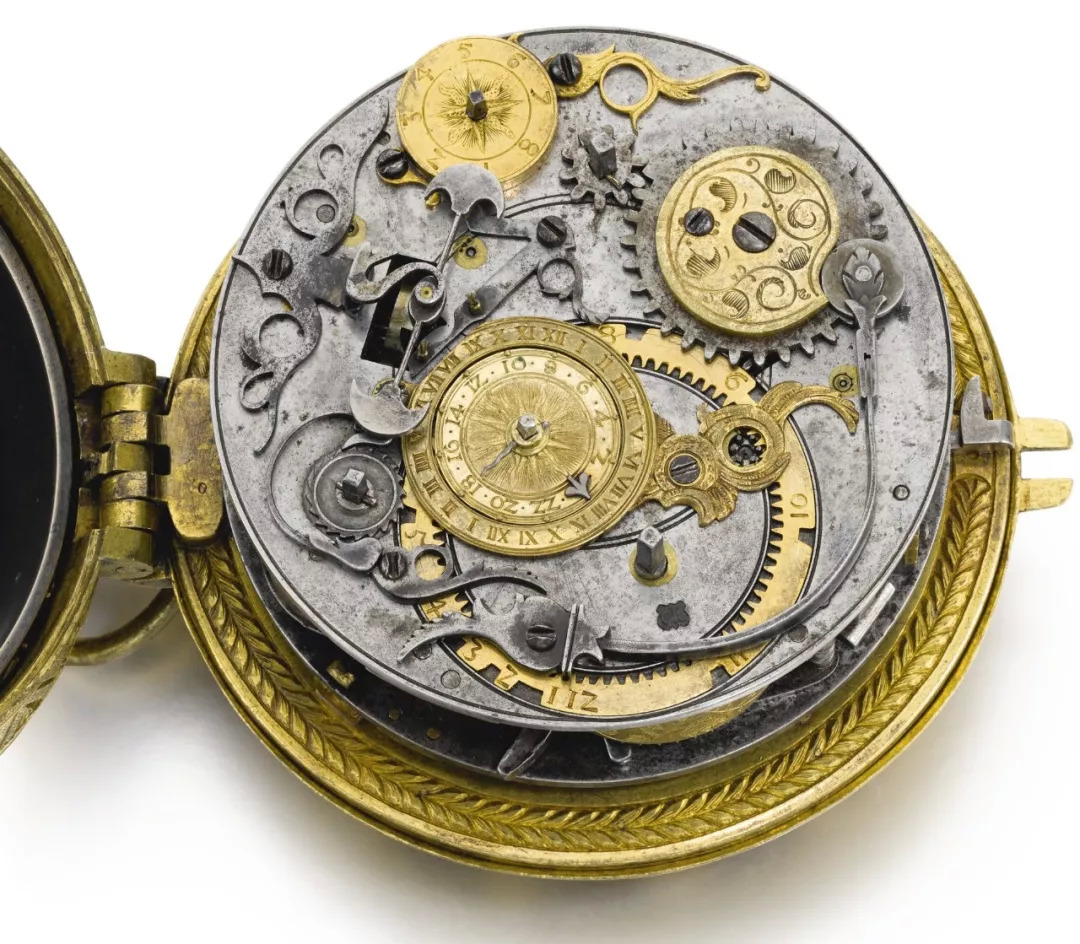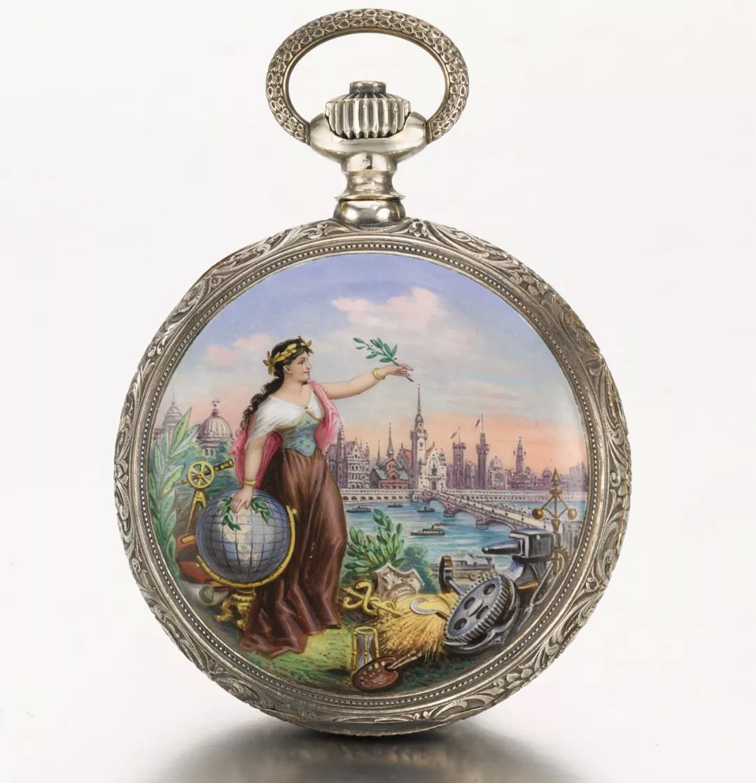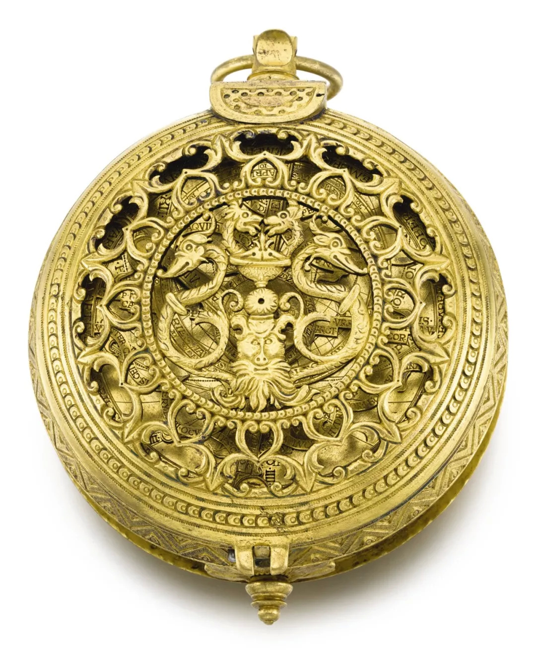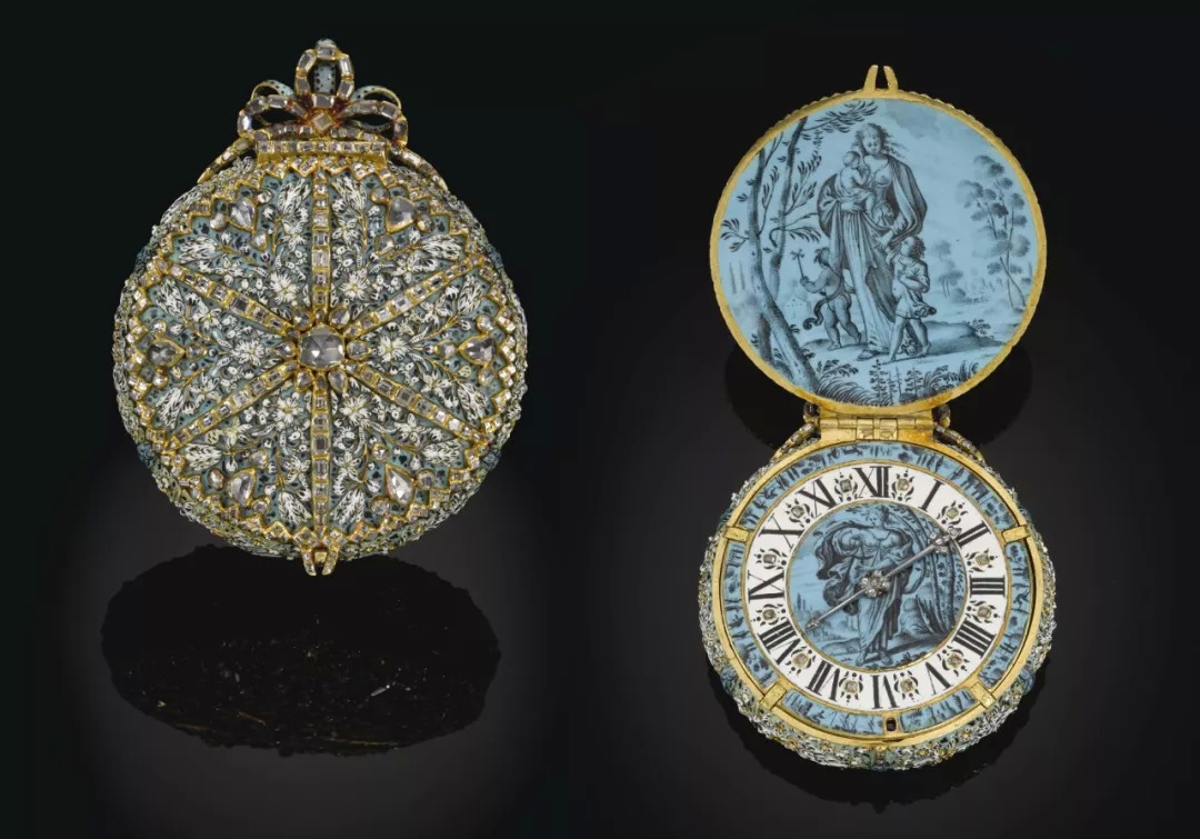 一枚十七世纪的怀表,Jehan Cresdorff作品,黄金表壳,镶嵌宝石,珐琅画装饰,大约制作于1650年,是钟表早期的珐琅工艺杰作,最后以220万英镑成交,创造了十七世纪怀表的最高拍卖价格纪录。