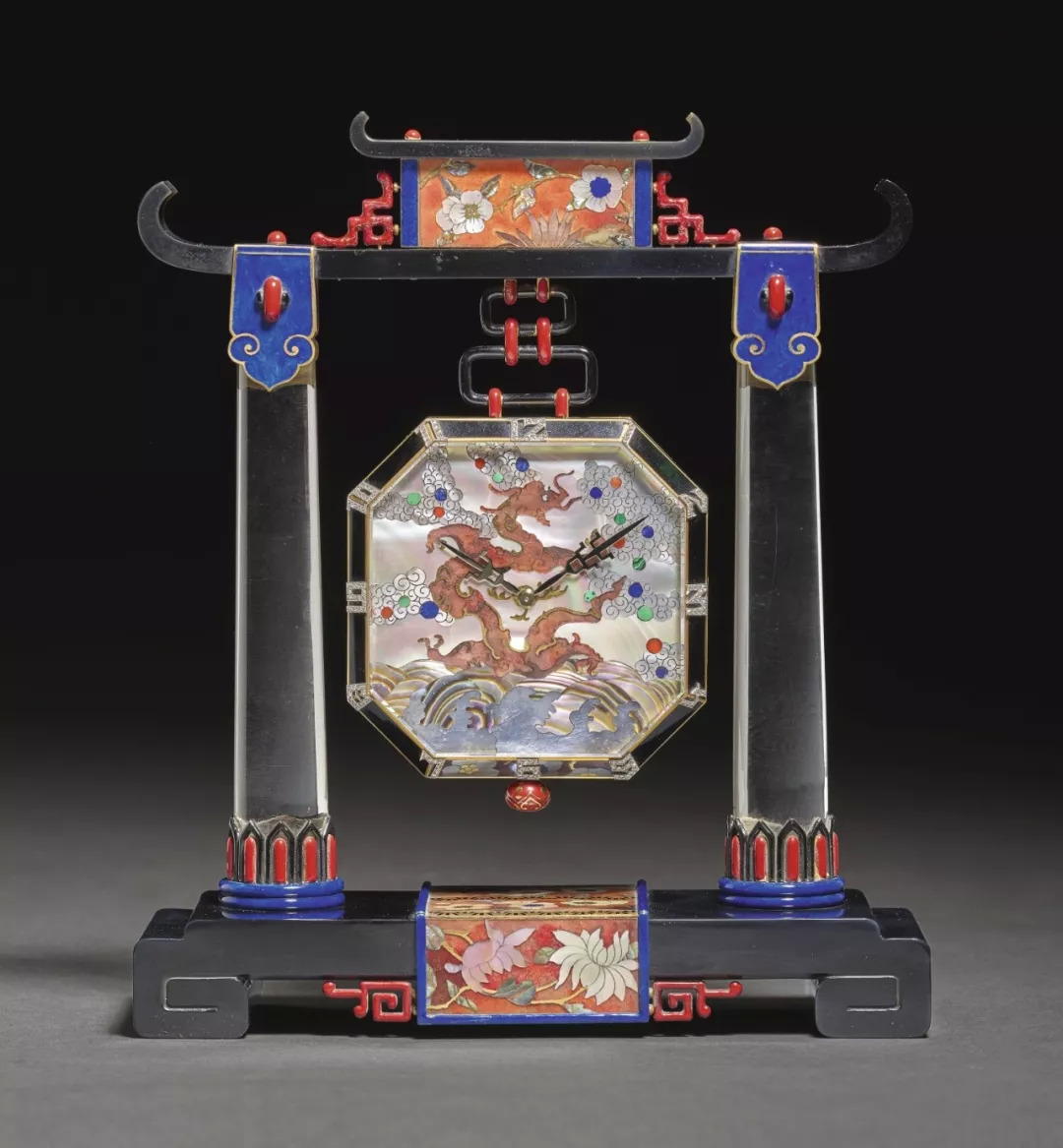 这件中国庙宇风格的座钟,1926年由江诗丹顿与Verger Freres公司合作完成,并通过当时巴黎一家重要的Art Deco风格钟表珠宝经销商Linzeler & Marchak 销售。