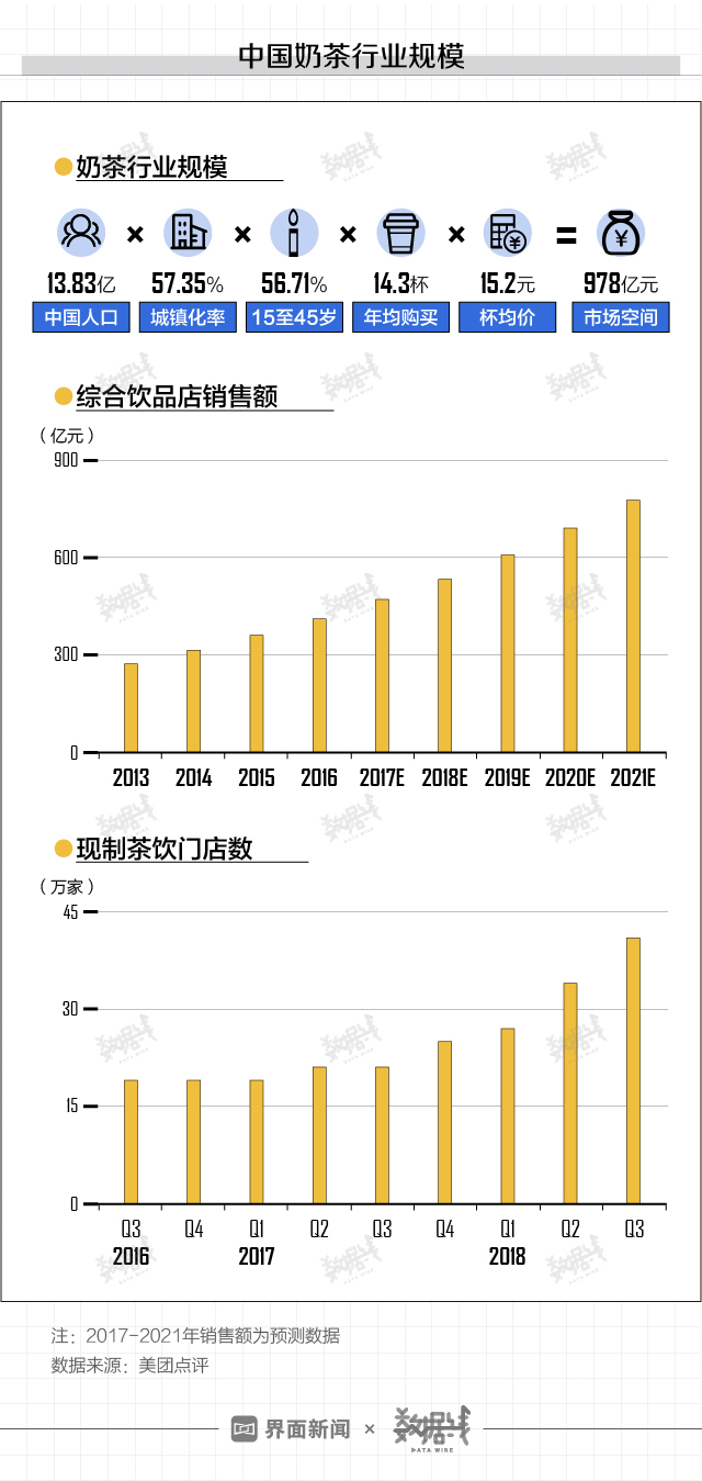 根据美团点评估算,中国奶茶行业规模接近千亿。2017年,国内综合饮品店销售额达472亿元,预计2021年达到779亿元。