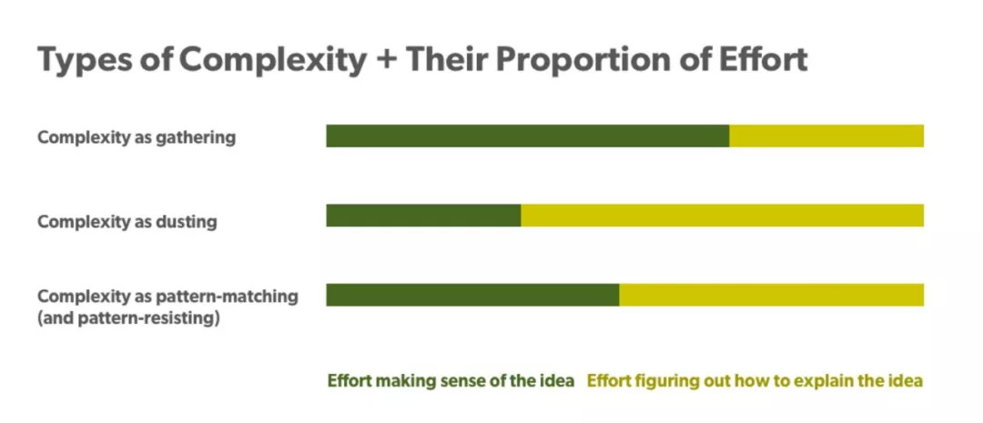 复杂本身不是最小的单元,还可以继续拆解。Urban归纳了三类复杂性,每一类都由一系列行动构成,可以逐步解决。分别是:收集信息的复杂性、信息“除尘”的复杂性、模式匹配(或模式冲突)的复杂性。如果你想理顺一个艰深的概念,每一项都需要分配不同比例的时间和精力。