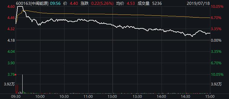 7月18日,中闽能源(600163.SH)高开后迅速拉升封住涨停,但随后即开板低走。盘面显示,约5分钟的涨停区间,是中闽能源全天交易最为活跃的时间段。截至收盘,中闽能源报每股4.27元,涨幅回落至2.15%,全天成交2.05亿元。