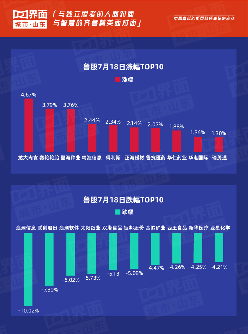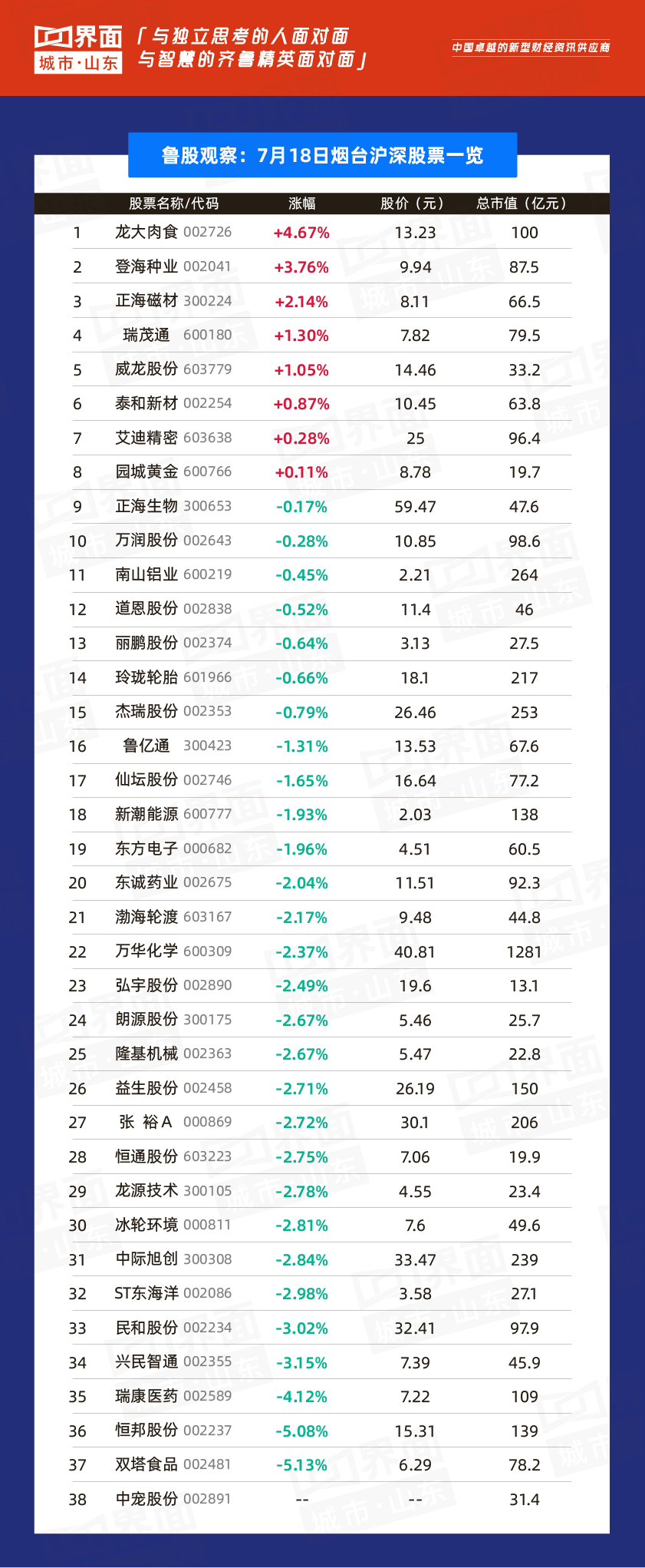 7月18日,山东省内沪深股票有32只个股看涨,168只下跌,1只与上一个交易日收盘价持平;