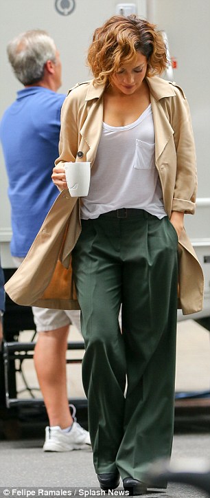 这几周来詹妮弗一直忙于本片的拍摄,然而繁忙的工作似乎并没有破坏她的好心情。在片场她边下阶梯边系紧睡袍,脸上洋溢着笑容,虽然头发看上去略乱,不过她已经化好了妆心情大好地准备工作。而上周三她抵达片场时则时髦多了,一件低胸T恤打底,配上阔腿裤和风衣,再踩上一双厚底高跟,下周就满46的她气场十足。她从今年6月4号起就一直在拍摄该NBC新片,同时她也是本剧的执行制片人。