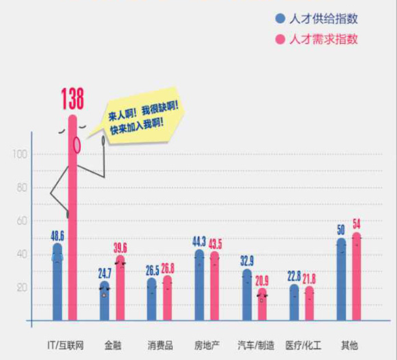 根据LinkedIn报告显示2015年,营销/销售、技术/研发是两大热门岗位,相对应计算机、数学和物理专业毕业生就业机会最大。猎聘网首发《2015年上半年互联网行业中高端人才生态报告》中统计的IT/互联网行业人才需求指数为138,而供给指数仅为48.6,尚有巨大用工缺口。新入行互联网产品经理平均年薪89411元,研发工程师平均年薪则达到176217元。还不止这些,2015年更是新增加几大高薪行业包括网络写手、职业差评师、自媒体运营官、段子手等,不管你有什么才华都有施展之处不至于待业。