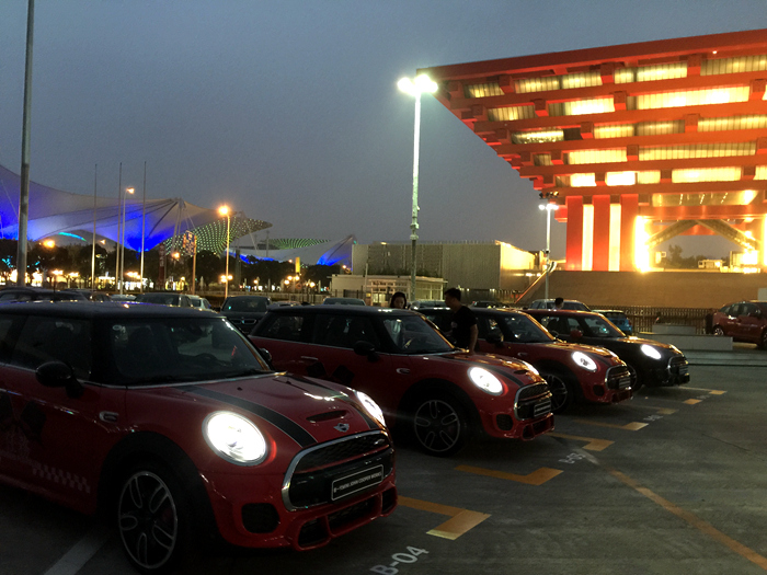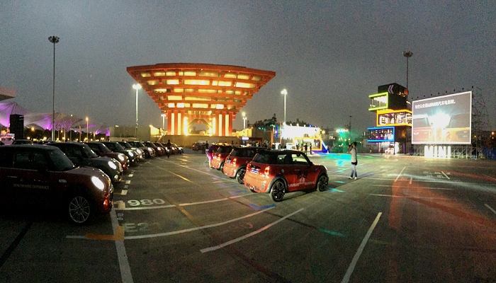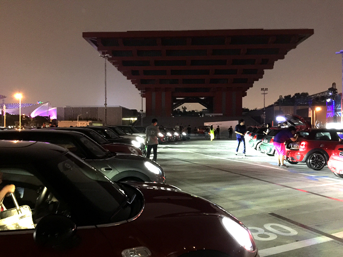 电影即将开始,连中国国家馆(现名中华艺术宫)都熄了灯。MINI你的面子可真够大的!