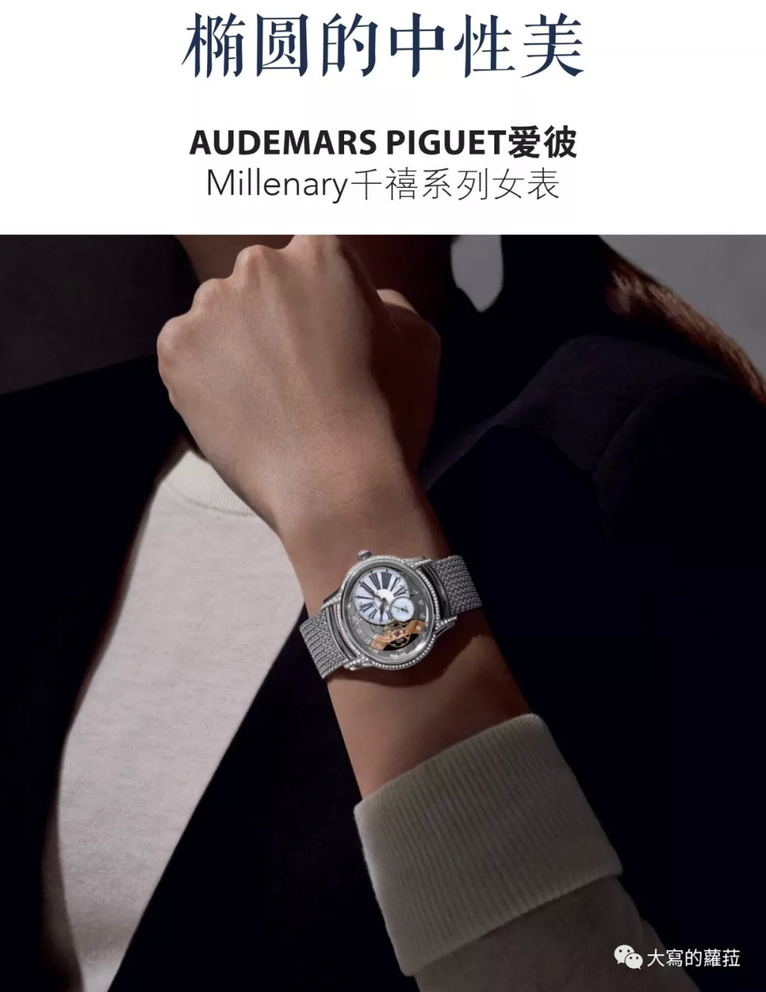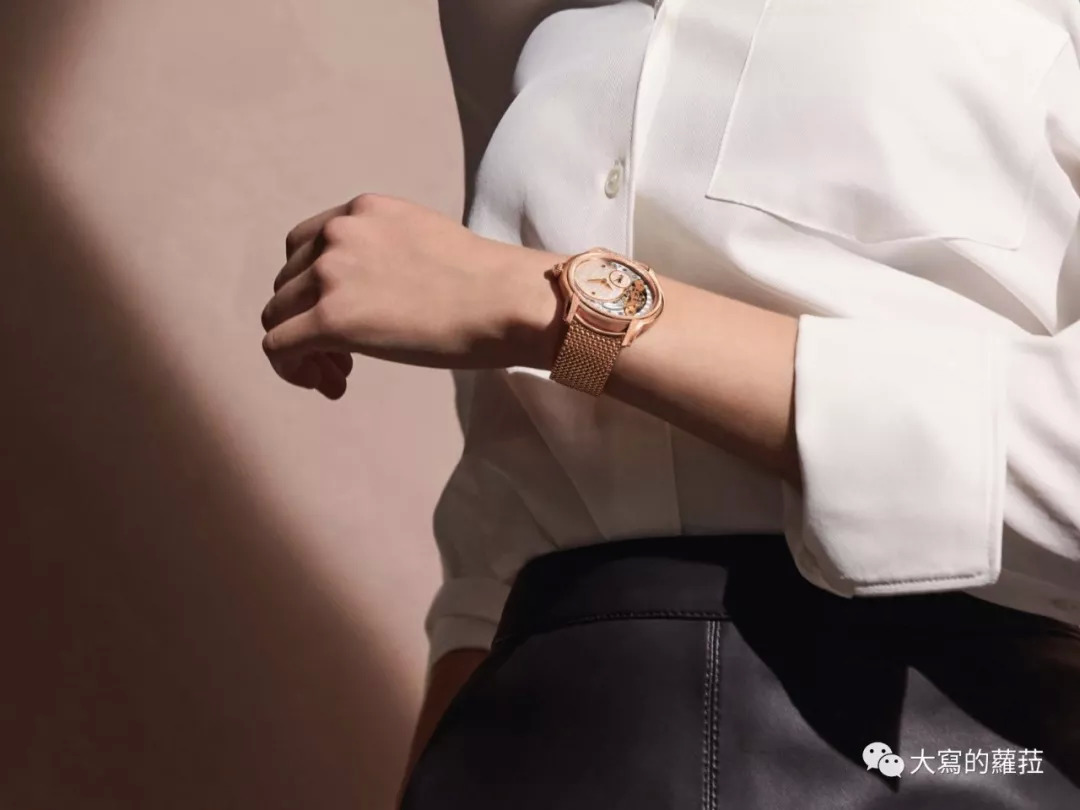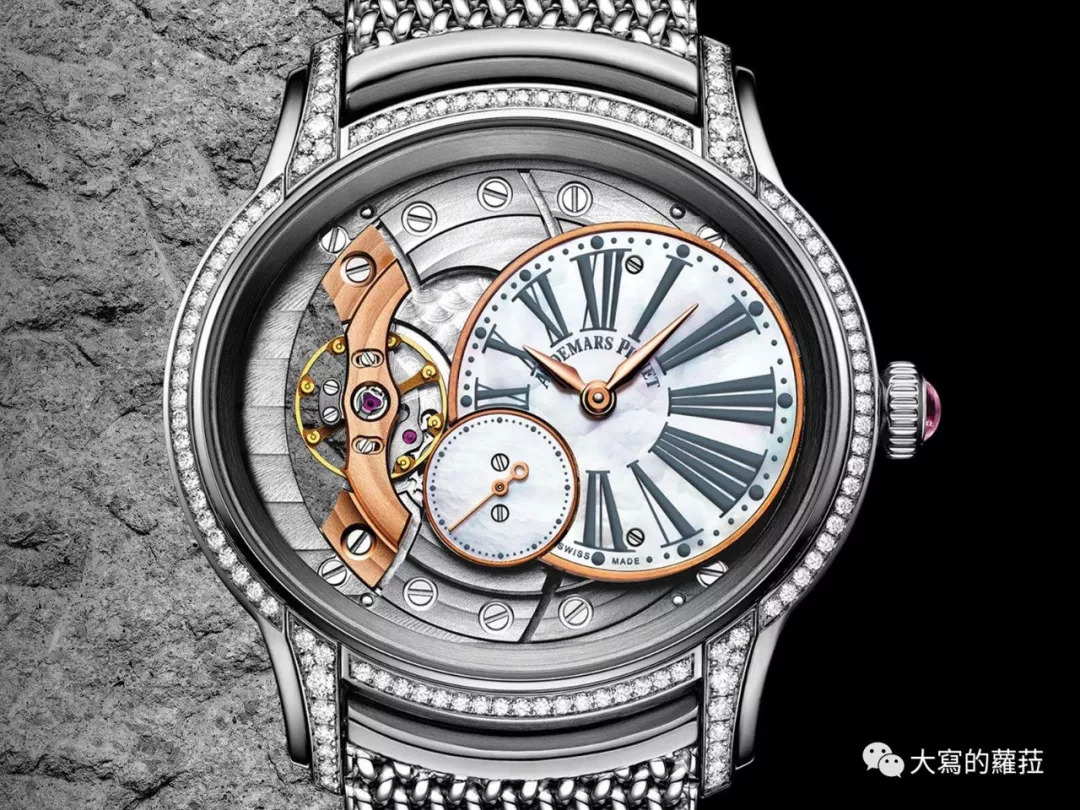 爱彼的千禧系列表款具有鲜明的壳型特色,3D立体结构的横椭圆形表壳搭配上偏心式表盘,刚柔并济的设计很适合当代较具中性风格的女性佩戴。爱彼千禧系列也是目前市面上少数搭载椭圆形机芯的款式,半镂空的盘面左侧将摆轮擒纵完全展露在表款正面,整体融合了考究的美学设计与技术工艺。尤其搭配金属编织表带的款式不仅呈现怀旧的优雅风情,佩戴还特别舒适服贴。