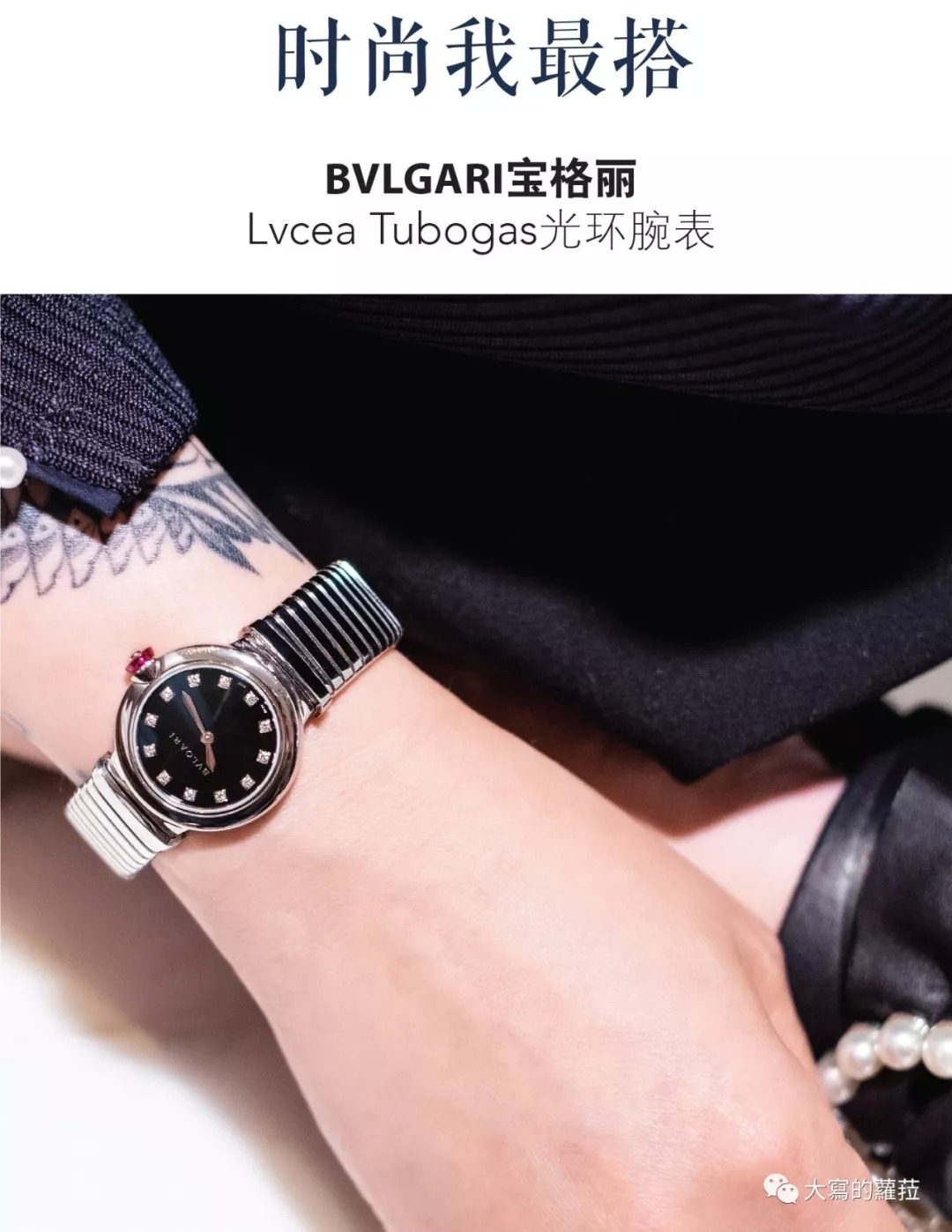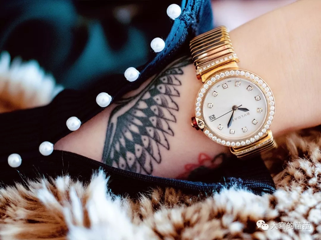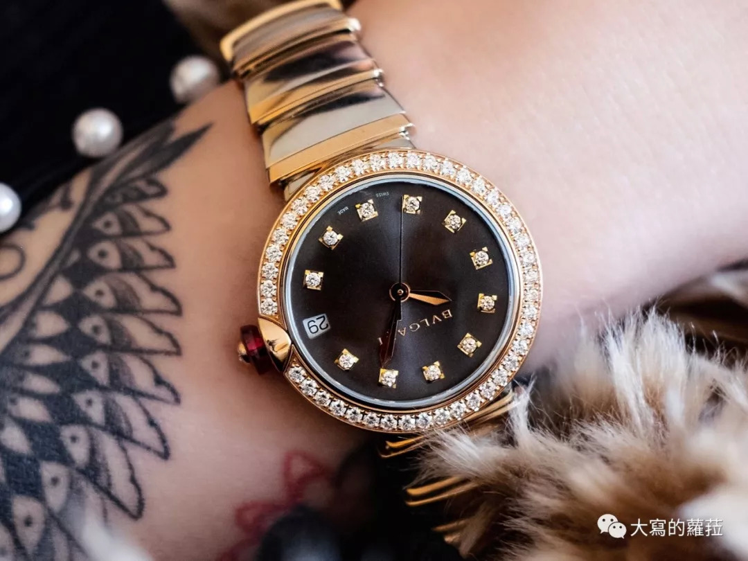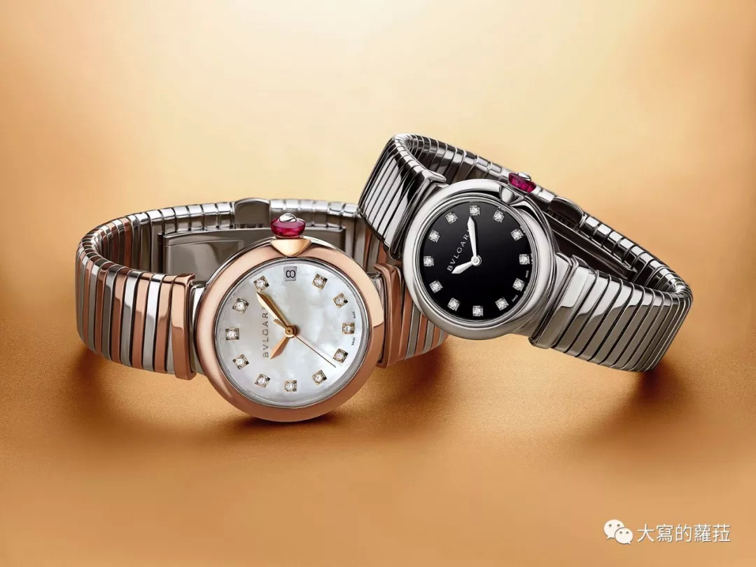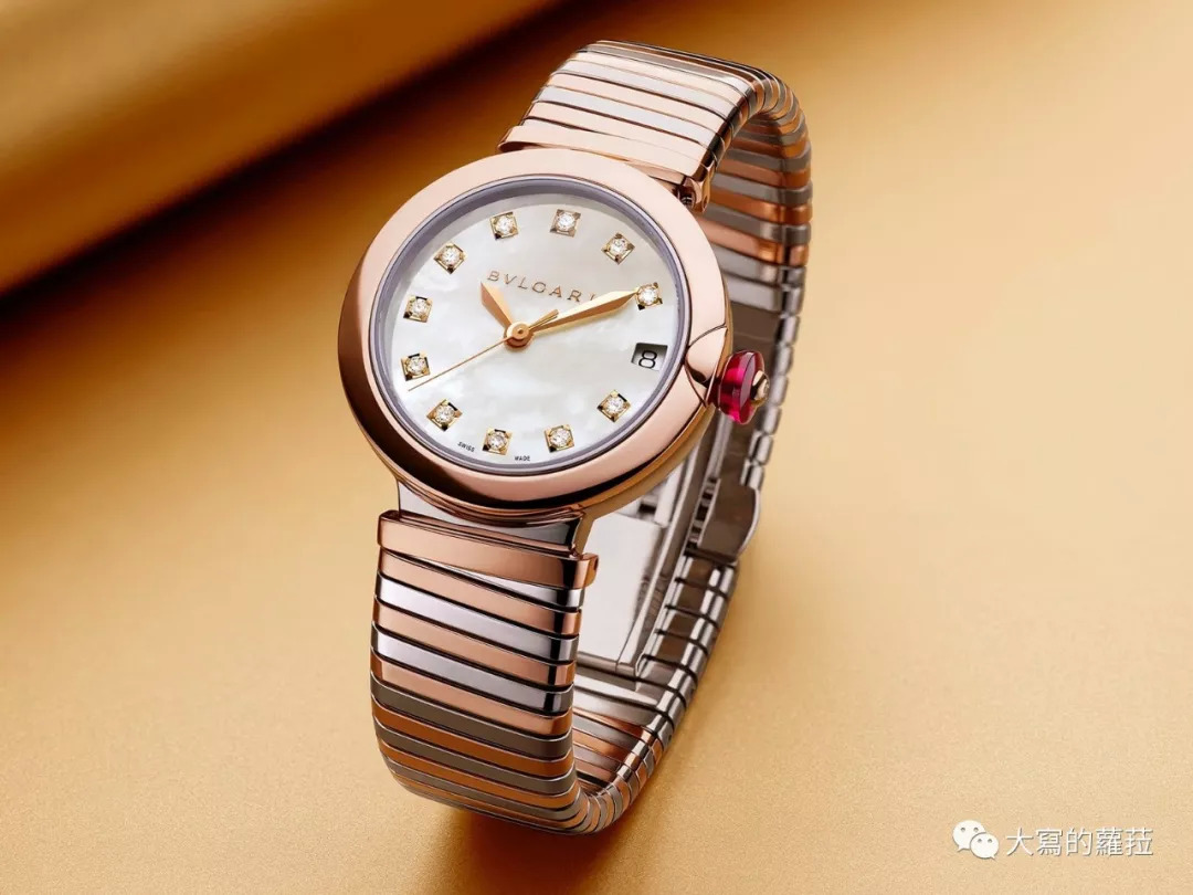 宝格丽的Lvcea系列或许乍看无法领会这一系独特之处,看似平实的圆形壳型设计,其实辨识点与设计特殊之处则集中在了表冠设计上。Lvcea的表冠上嵌了一颗大尺寸的粉色宝石,托着宝石的基座则直接内嵌在表壳上与表壳合为一体,这个设计实际上是为表壳生产增添了不少的麻烦工序,但也由于凸起式宝石表冠设计让表冠更容易轻松拉开调时,不用再怕会伤到美美的指甲了。Lvcea光环腕表则是搭配上了宝格丽标志性工艺的Tubogas链带,是腕表也似手链,更适合女性穿搭于不同服装风格与场合。